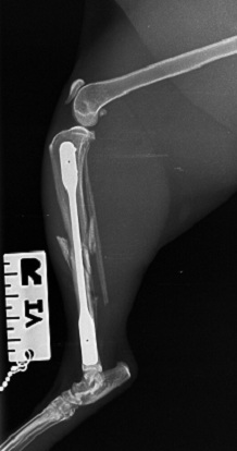 Feline tibia-fibular fracture, immediate post-op following LokRod repair.