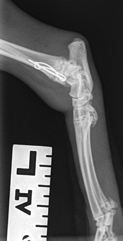 If the radius and ulna (the bones of the forearm) grow at different rates, the elbow joint will not form properly and the abnormal forces within the joint may result in damage to the joint, most commonly to an area on the ulna called the medial coronoid. Elbow dysplasia can be extremely uncomfortable. It can also be an extremely frustrating disease to manage as 100% correction of the abnormal forces within the joint is unlikely and arthritic changes are likely to occur with or without surgery.
